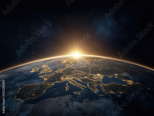 © Kanchanit, Obraz premium breathtaking view of Earth from space, showcasing Europe illuminated by city lights as sun rises on horizon, creating hopeful and serene atmosphere