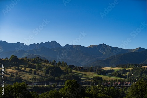 © Strikernia, Naklejka premium Breathtaking view of mountain range under clear blue sky during early morning light in a serene landscape setting