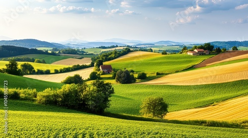 Fototapeta premium Breathtaking view of rolling hills and lush fields under a clear sky,...
