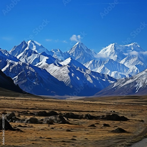 Fototapeta premium Breathtaking view of snow-capped mountains under a clear blue sky, with a...