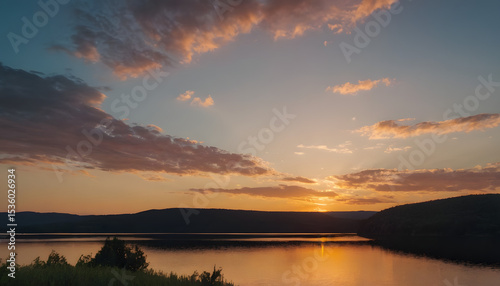 © soyibakter, Obraz premium Breathtaking view of sunset on the lake with soft light