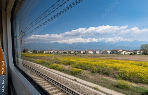 © Road Red Runner, Naklejka premium Breathtaking view of the Alps from inside an express train traveling through Italy with blooming yellow rapeseed flowers