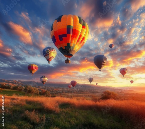© Roey, Naklejka premium Breathtaking View of World Hot Air Balloon Race at Sunrise. Colorful Balloons Drift Above Expansive Field