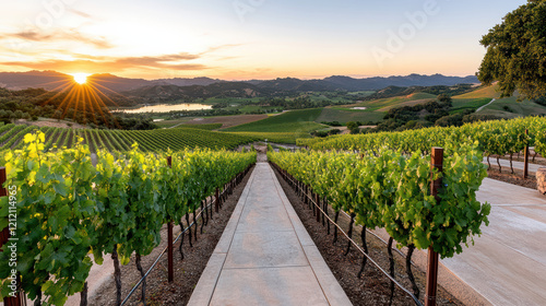 © siraphol, Naklejka premium Breathtaking vineyard landscape at sunset with lush grapevines