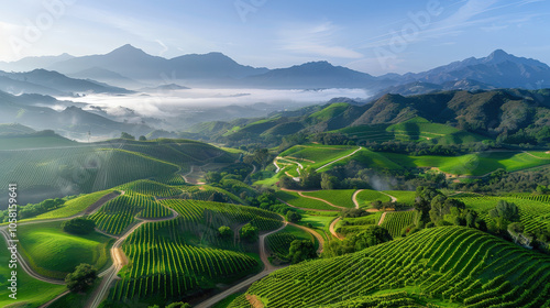 Fototapeta premium Breathtaking vineyard landscape with lush green hills, winding paths, and...