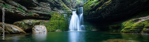 Naklejka premium Breathtaking waterfall cascading into a serene pool surrounded by lush greenery.