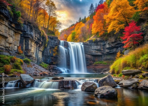 © kittipon, Obraz premium breathtaking waterfall plunging into a serene river surrounded by steep rocky cliffs and vibrant autumn foliage with a sense of movement