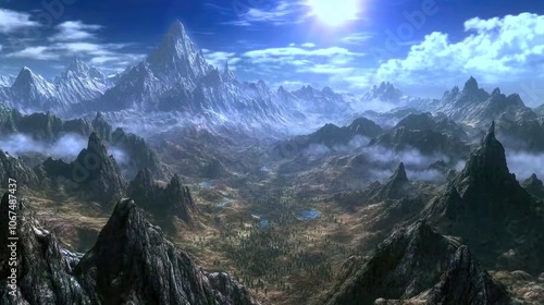 Naklejka premium Breathtaking winter landscape features towering snow-covered mountains under a clear sky. The sun shines brightly, illuminating the serene valleys and glimmering lakes nestled below