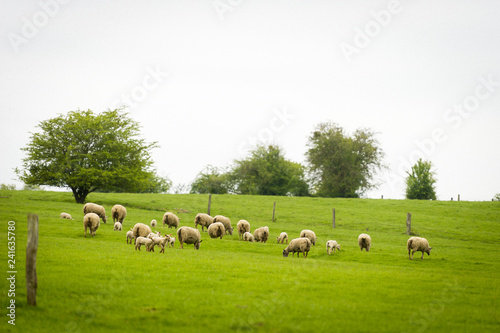 Fototapeta premium Brebis et agneaux se promènent dans une prairie au printemps