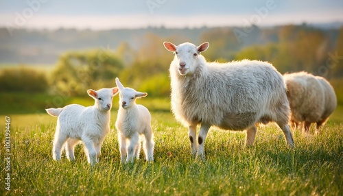 Obraz premium Brebis et ses agneaux dans une prairie ensoleillée