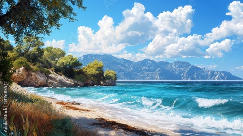 © Babb, Fototapeta premium Breezy coastal setting features lively waves crashing on a sandy beach. Lush greenery lines the shore, complemented by distant mountains under a clear blue sky