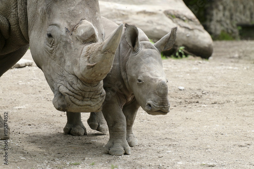 © Aggi Schmid, Obraz premium Breitmaulnashorn mit Jungtier frontal nebeneinander, Ceratotherium simum