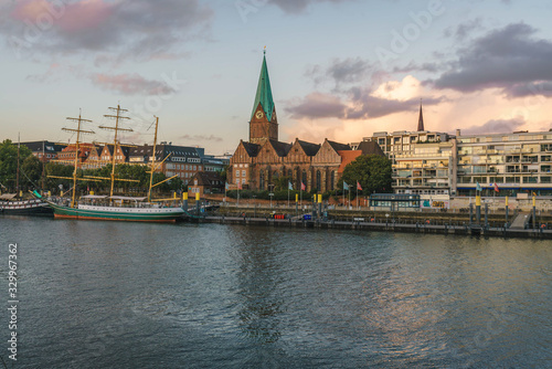 © Sen, Obraz premium Bremen Cityscape on the Weser River during the sunset