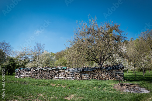© focus finder, Fototapeta premium Brennholzlager im Frühjahr