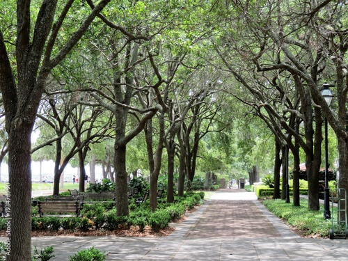 © crlocklear, Fototapeta premium Brick and cobblestone path lined with trees in Charleston, South Carolina, SC