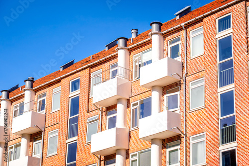 Fototapeta premium Brick apartment building with balconies against a blue sky in Copenhagen,...