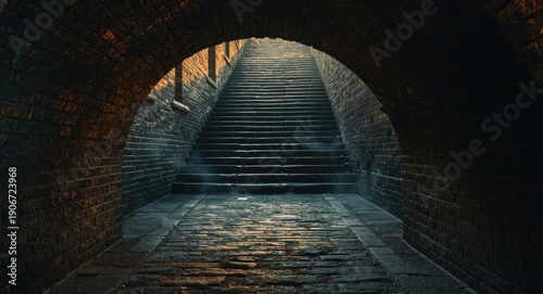 Fototapeta premium Brick arch tunnel with stone floor leading to stone staircase in dark...