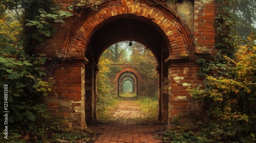 Fototapeta premium Brick archway leads to autumnal path. Ideal for fantasy, mystery, or...
