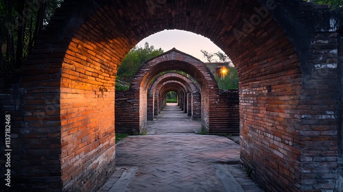 © siyons, Fototapeta premium Brick Archway Pathway Leading Through Serene Garden