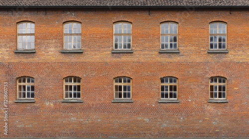 © AbstractAI, Obraz premium Brick building facade featuring multiple windows showcasing vintage architectural design and textured wall elements