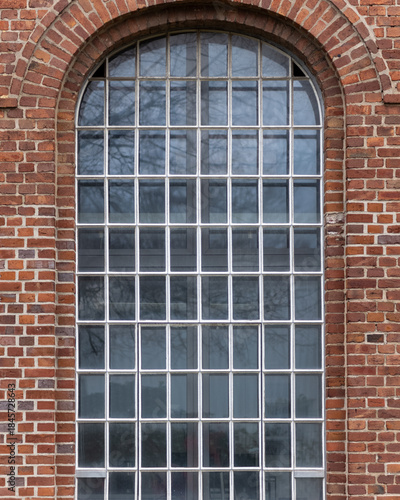 © Ulrich, Obraz premium Brick building features large arched window with grid pattern and reflective surface in urban setting