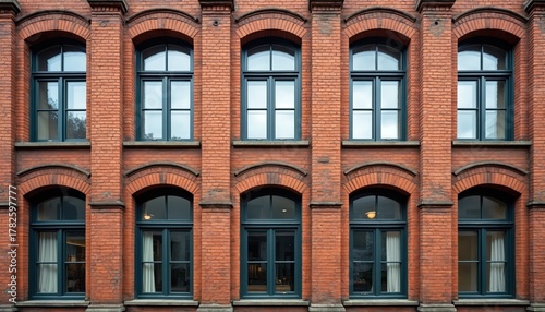 © miss irine, Fototapeta premium Brick building shows window pattern. Architectural element on building facade. Urban photo of many identical windows. Old apartment windows. Downtown area with vintage construction. Classic exterior