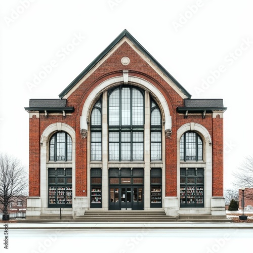 © Murda, Fototapeta premium Brick building with large windows and a door.