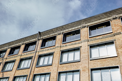 © supersomik, Fototapeta premium Brick building with windows and downspout against blue sky