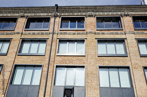 © supersomik, Fototapeta premium Brick building with windows and downspout against blue sky