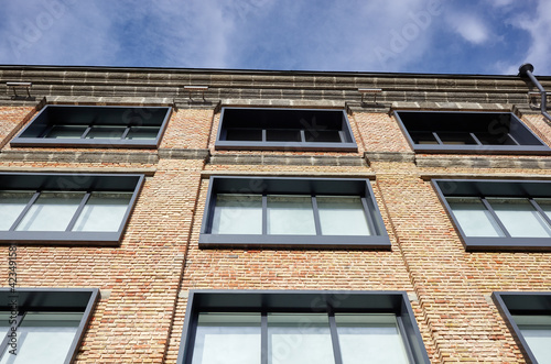© supersomik, Fototapeta premium Brick building with windows and downspout against blue sky
