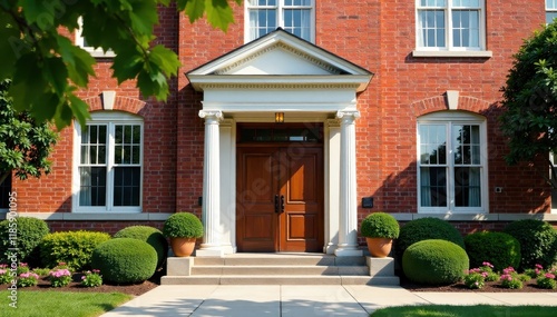 © Udomner, Obraz premium Brick facade with traditional school building entrance, exterior, school