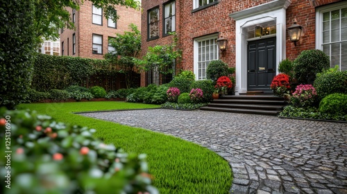 Obraz premium Brick house, garden, cobblestone path, spring flowers, real estate