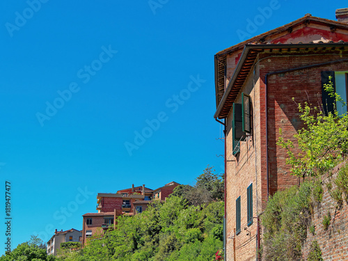 © Dimitrios, Fototapeta premium Brick houses of Siena rise along a verdant hillside under a blue Tuscan sky — a glimpse of Italy’s charm and architectural grace. Space for text and logo.