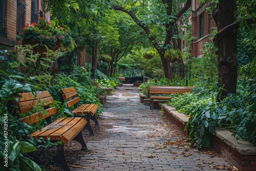 Obraz premium Brick Path Through A City Park With Wooden Benches