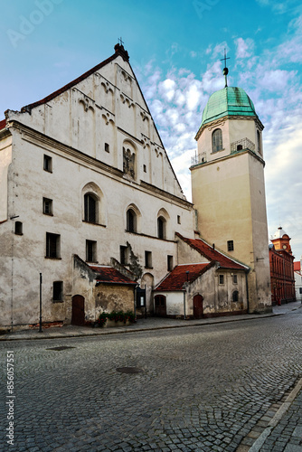 © GKor, Fototapeta premium Brick tower of a historical church in the city of Wschowa in the evening