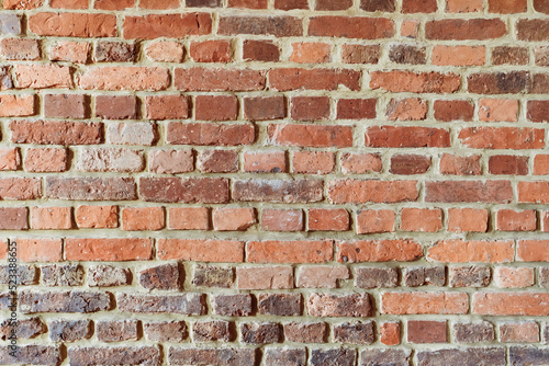 © velishchuk, Obraz premium Brick wall background. Pattern brown color design decorative uneven cracked real stone wall surface with cement. Dry brick wall as seamless background
