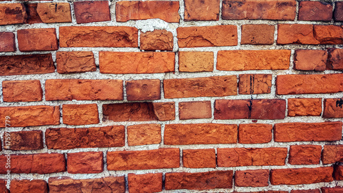 © byswat, Obraz premium Brick wall made of red stone background. The spoiled brick is vintage.