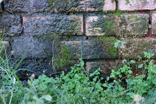 Fototapeta premium brick wall moist moss green leaves damp