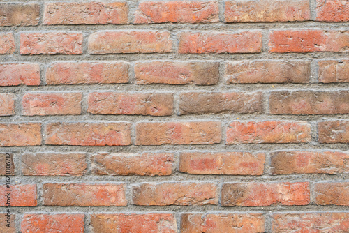 Obraz premium Brick wall of different shades of orange red and brown, typical spoon masonry...