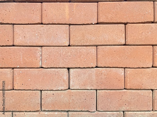 Obraz premium Brick Wall, The image shows a close-up of a brick wall constructed with light reddish-brown bricks, arranged in a staggered pattern. The bricks have a rough, textured surface.