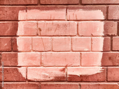Obraz premium Brick wall with fresh paint applied in rectangular patch creating a contrast against the textured background