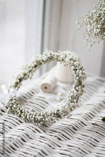 Obraz premium Bridal flower crown. White gypsophila wedding accessories. Bridal flowers in white colors
