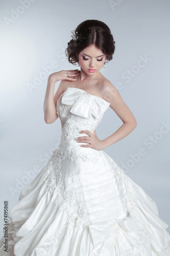 © Victoria Andreas, Fototapeta premium Bridal makeup, hairstyle. Beautiful charming bride in wedding lu