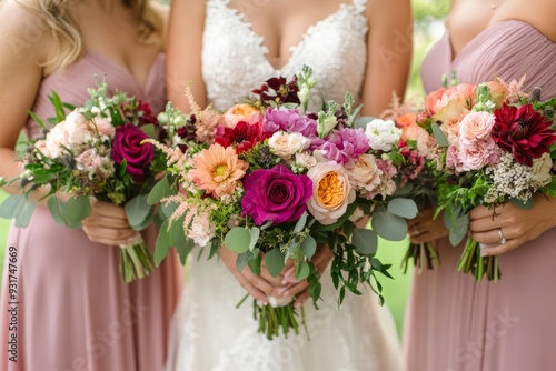 Fototapeta premium Bride and bridesmaids holding bouquets of flowers, wedding ceremony, wedding...