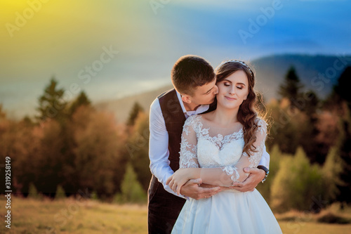 © volody10, Fototapeta premium Bride and Groom at Sunset Romantic Married Couple