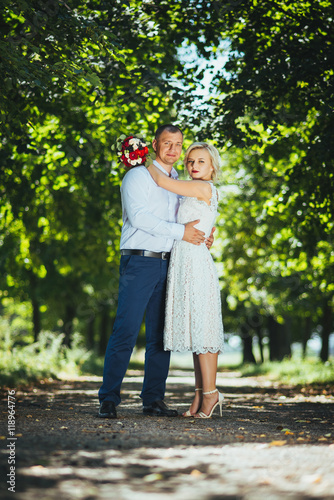 © deineka, Fototapeta premium Bride and groom at wedding day, walking outdoor at summer on nature. Bridal couple, happy newlywed woman and man embracing. Loving wedding couple outdoor.