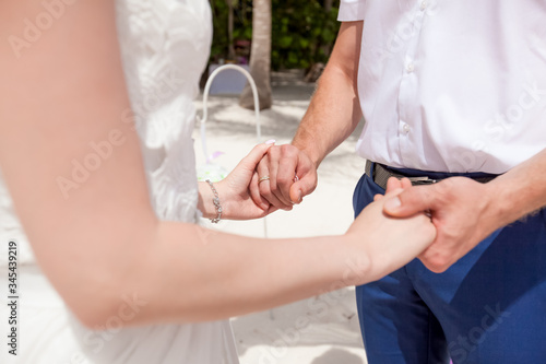 © Irina, Fototapeta premium Bride and groom exchanging wedding rings close up during symbolic nautical decor destination wedding marriage on sandy beach in front of the ocean in Punta Cana, Dominican republic