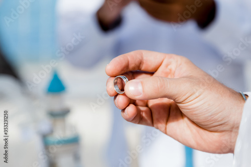 Fototapeta premium Bride and groom exchanging wedding rings close up during symbolic nautical...