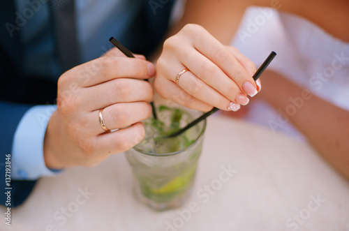 © fomenkodmitry, Obraz premium bride and groom holding wineglass with cocktail with lime