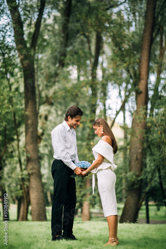 Fototapeta premium Bride And Groom In Love Holding Hands Standing In Park